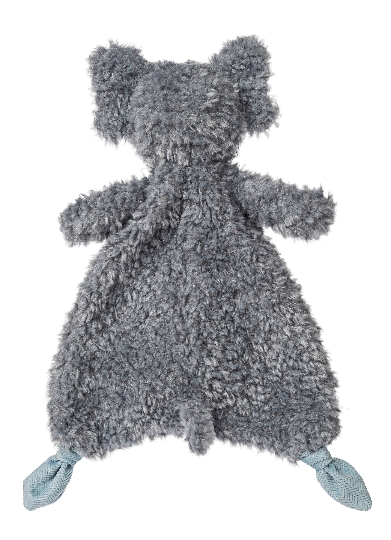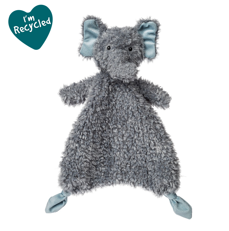 SOFT TOY LOVEY: Elephant is a comforting cuddle toy with an under-stuffed body in textured grey fabric with knotted corners at the feet; lovey has a soft sculpted face with embroidered eyes