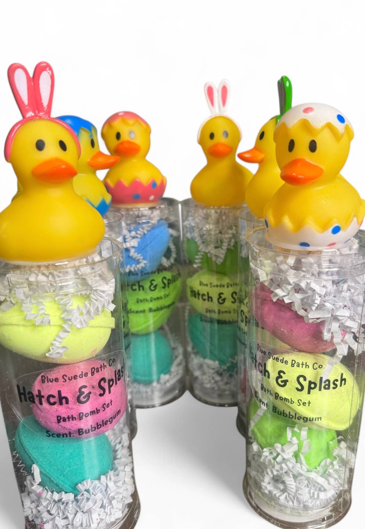 Make a splash this Easter with the Hatch & Splash Bath Bomb Set! Each set includes 3 vibrantly colored Easter Egg bath bombs, scented in sweet, nostalgic Bubblegum. Watch as they fizz and transform your bath water into the color of the egg. Topped with an adorable Easter-themed duck, this set is perfect for gifting or adding a whimsical touch to Easter baskets. Ducks and egg colors may vary, making each set a delightful surprise! Vegan formula and free from Sulfates and Parabens.