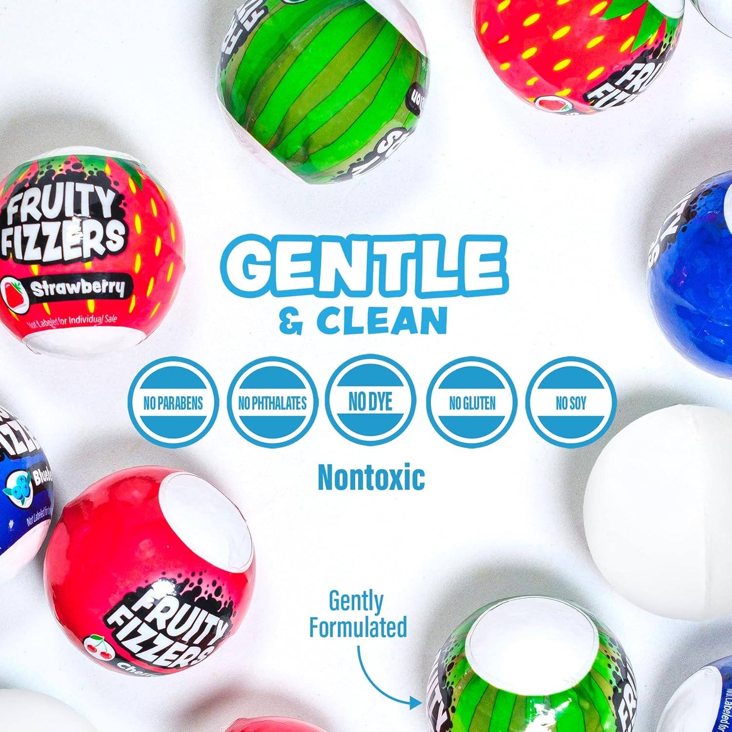* FRESH & FRUITY: Bursting with kid-approved scents—Watermelon, Cherry, Strawberry & Blueberry—these dye free bath bombs fill the tub with a delightful fruity aroma and bath bubbles for kids!
