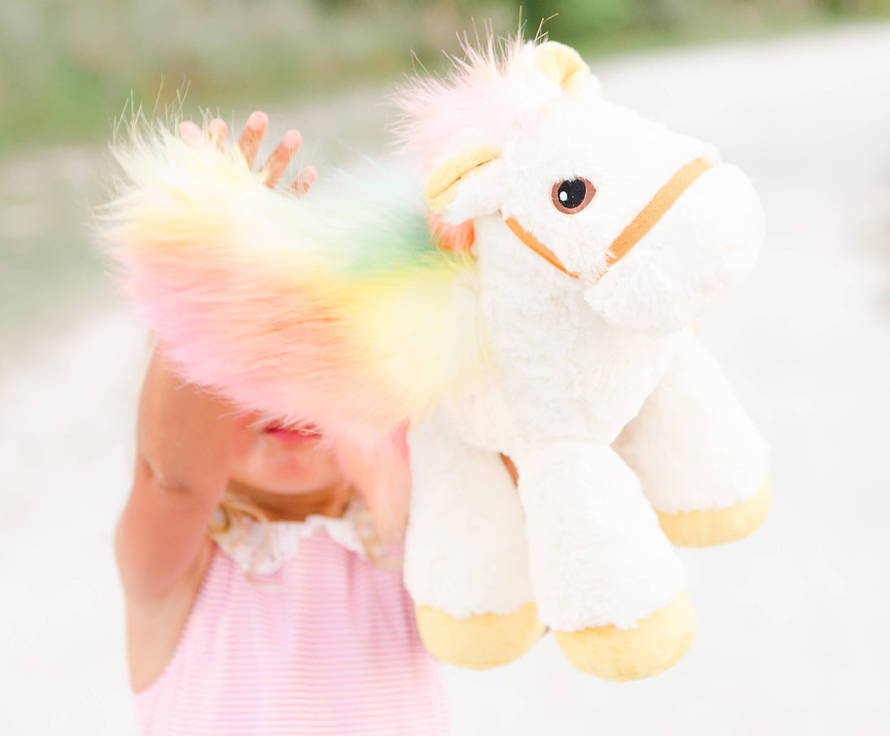 NEW — Luxuriously soft white faux fur. Rainbow wings, mane and tail with pink feet. Embroidered eyes that always see the best in you. Saddle handmade in Texas.