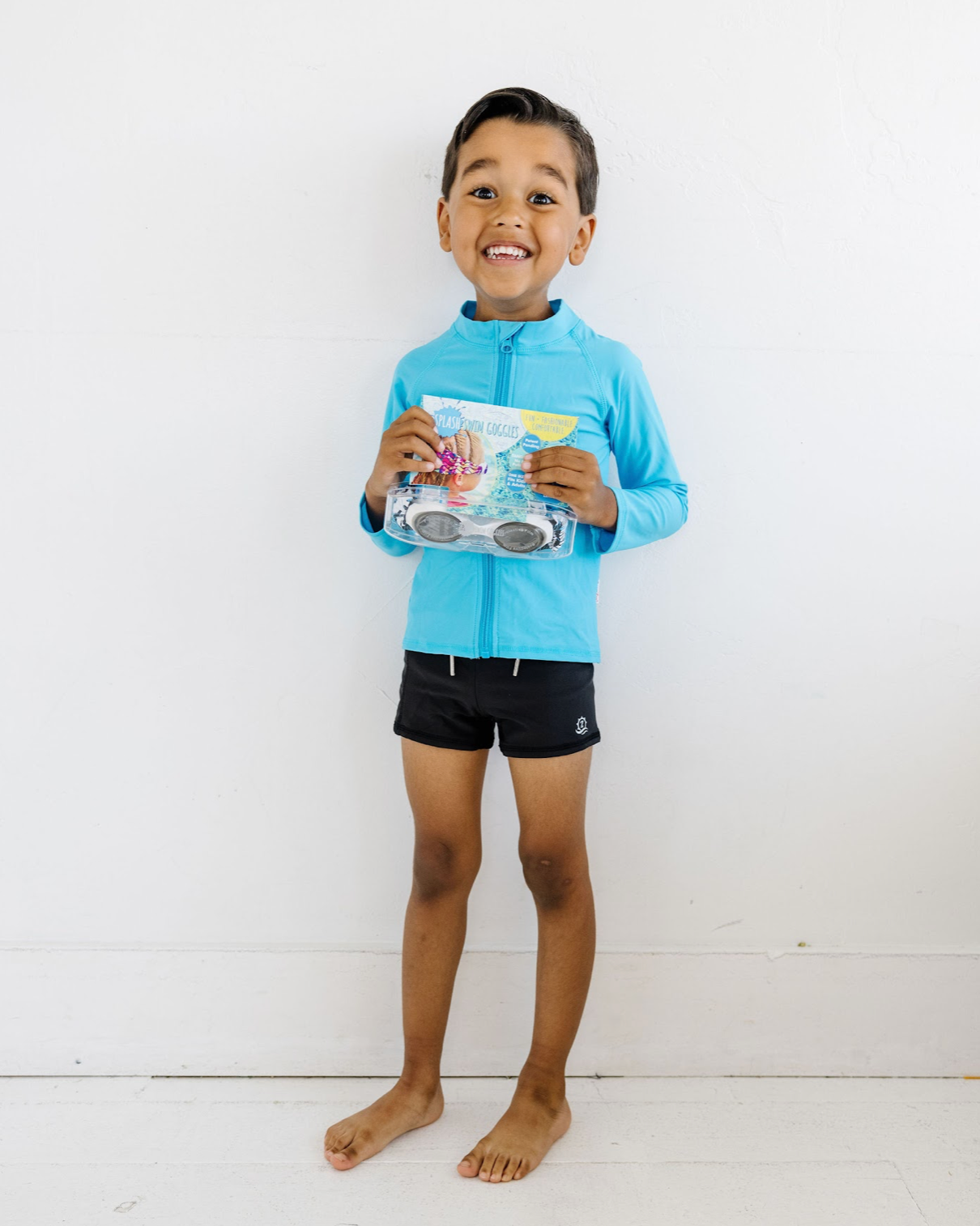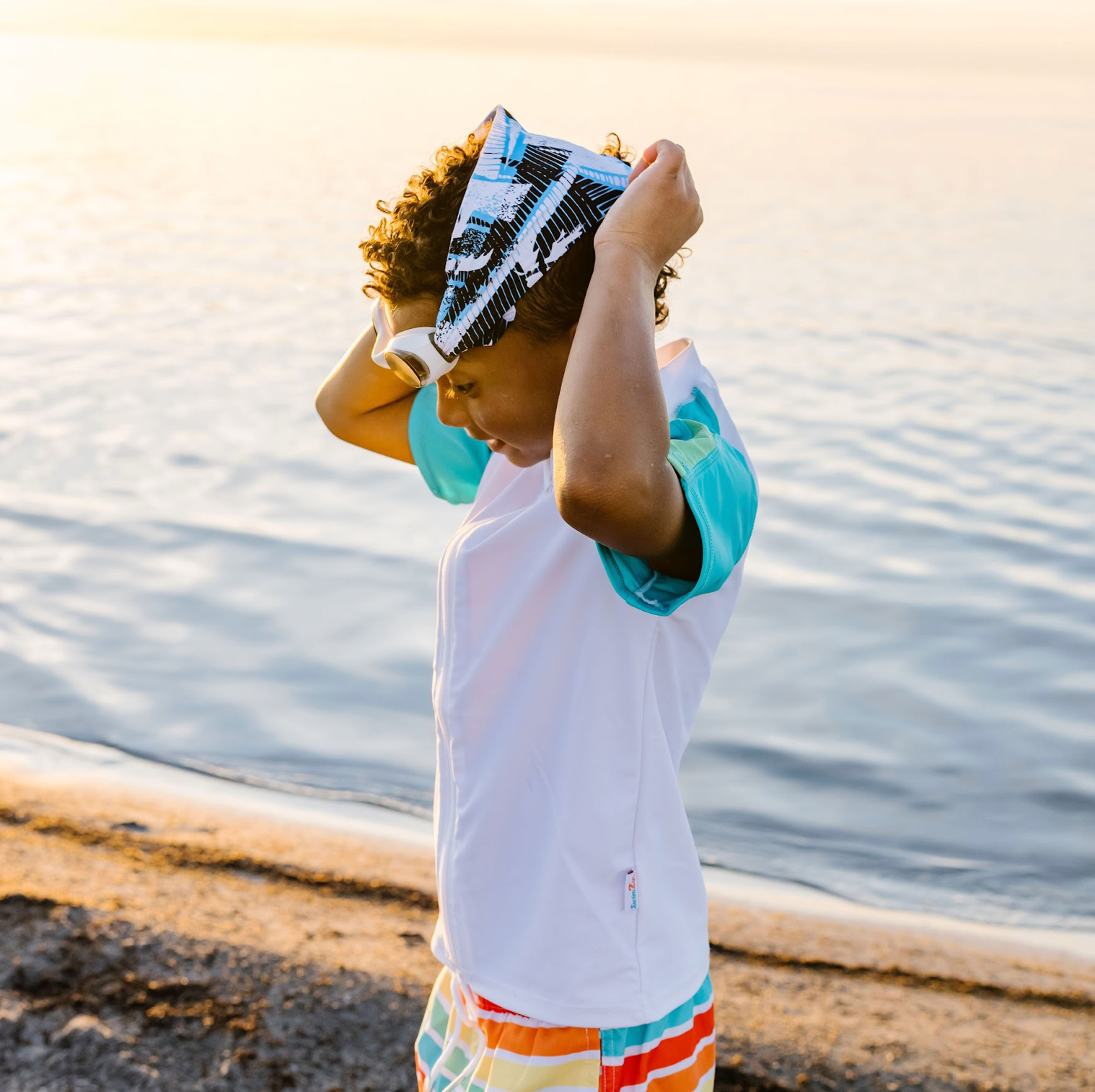 Our Boardwalk swim goggle features our tangle-free strap in a blue, black and white abstract palm print, paired with a white frame and lightly tinted grey lenses.