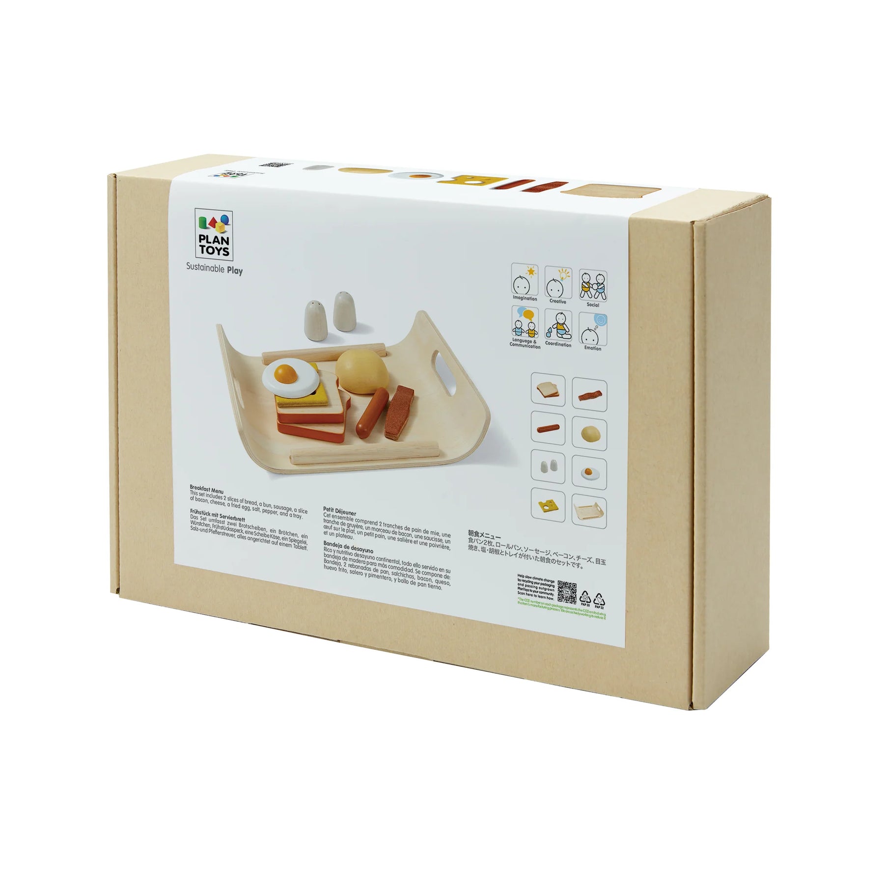 Start your day with a healthy breakfast! Set includes 2 slices of bread, a bun, sausage, slice of bacon, cheese, fried egg, salt, pepper and a serving tray.