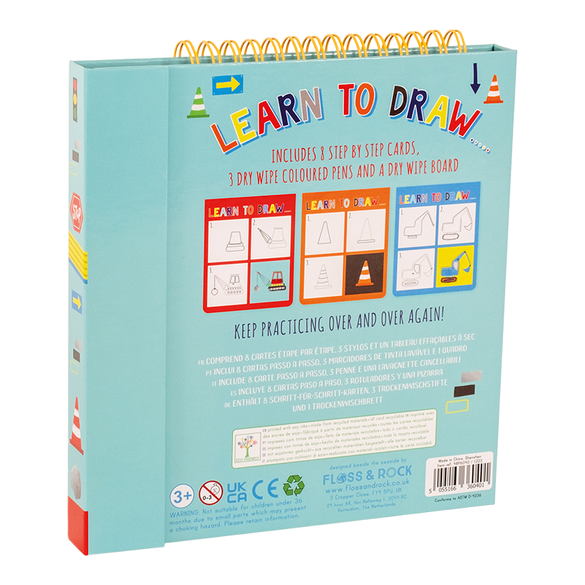 Become a budding artist with our Construction themed Learn to Draw activity. Open the book to reveal 8 thick glossy pages, 3 colour dry wipe pens with erasers and a draw and colour section to copy the image. Each page has a 3 step guide as to how to draw your masterpiece! The book folds almost flat with a magnetic closure and is perfect for travel and taking out and about. Reusable over and over again. FEATURES Perfect for travel and taking out and about Learn how to draw in 3 easy steps 3 colour dry wipe pens with erasers Easy to flip pages Folds away almost flat Eco-friendly Recommended age 3+ DIMENSIONS: 17.5cm x 18.5cm x 2cm