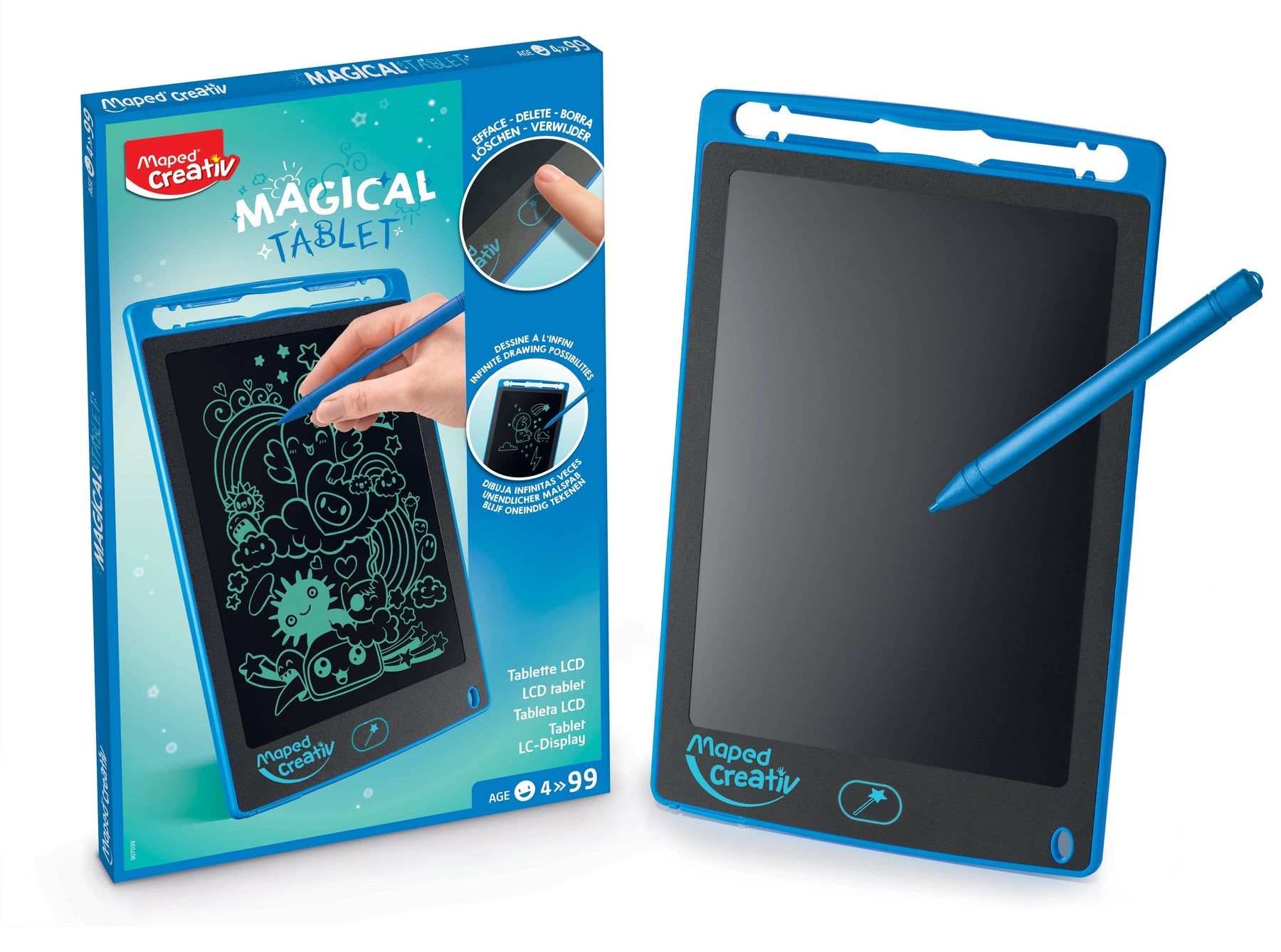 The Maped Creativ Magical Drawing Tablet is an innovative solution for young artists while on the go with infinite drawing potential! Perfect first tablet for young children - draw again and again and again and instantly erase your drawing by pushing the magic button. Included stylus snaps into board body for storage; no messy ink or graphite means no mess. Travel-friendly design is super light and thin - perfect for use on the go! Includes 1 Magical Drawing Tablet and Stylus. Powered by a (included) small watch battery. For ages 4+. Dimensions: 0.2” x 5.8” x 9” Maped Creativ offers a collection of innovative, ultra-fun and stimulating activity kits for children of all ages! All kits are designed to be made with their own hands with minimal adult assistance to produce unique creations to play with and display.