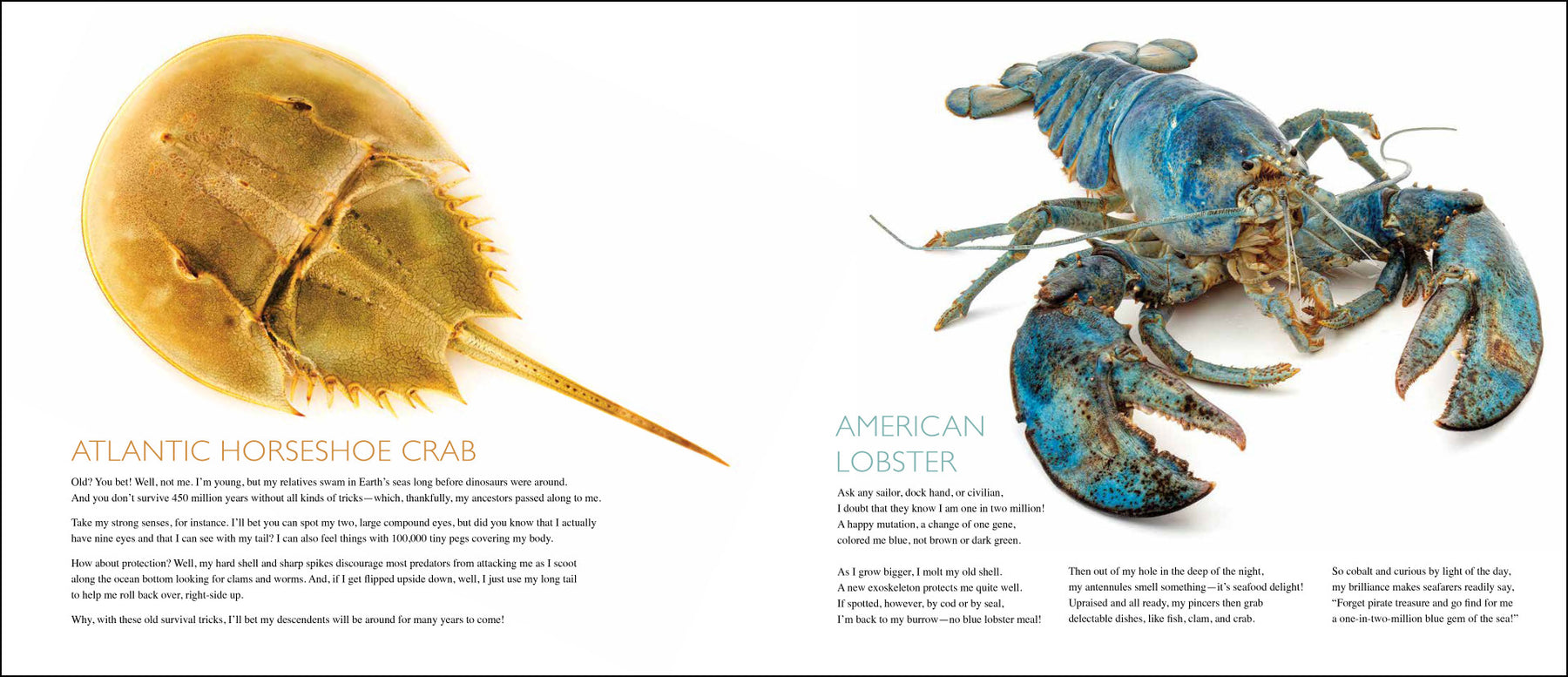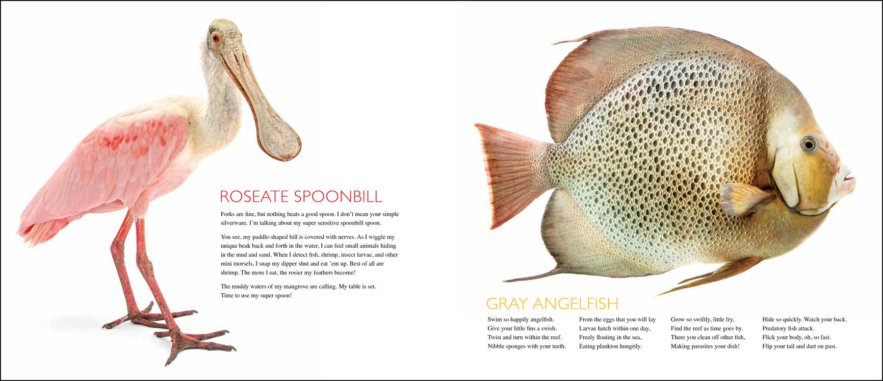 Amazing marine animals – from a blue lobster to a spectacular spoonbill – posed for portraits. Good thing photographer and writer David FitzSimmons jotted down what the agile angelfish, singing sea star, proud puffin, and other Curious Critters had to say! Includes visual index, silhouette game pages, and glossary. Ages 2-8, 32 pages, 11″ x 9.5″ hardback. ISBN 9781936607723