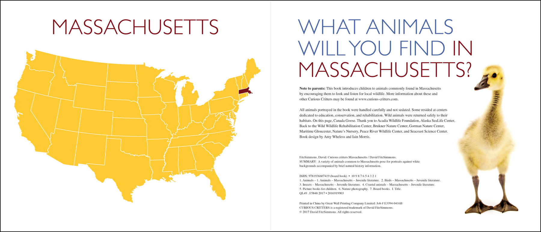 Curious Critters Massachusetts introduces young readers to common backyard animals found in the Bay State. Fun and educational, this board book features a mink, deer, bass, coot, porcupine, crab, lobster, and more! Part of the “Look & Listen” series, Curious Critters Massachusetts encourages young nature lovers and their families to watch and listen for wildlife in their own backyards and other places near home. 20 pages, 7″x 6″ hardback.