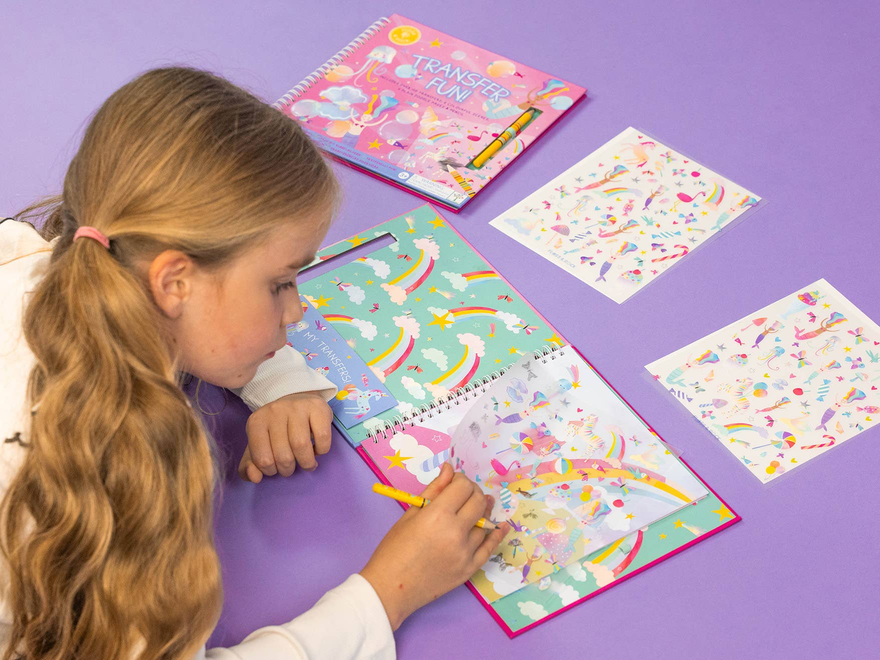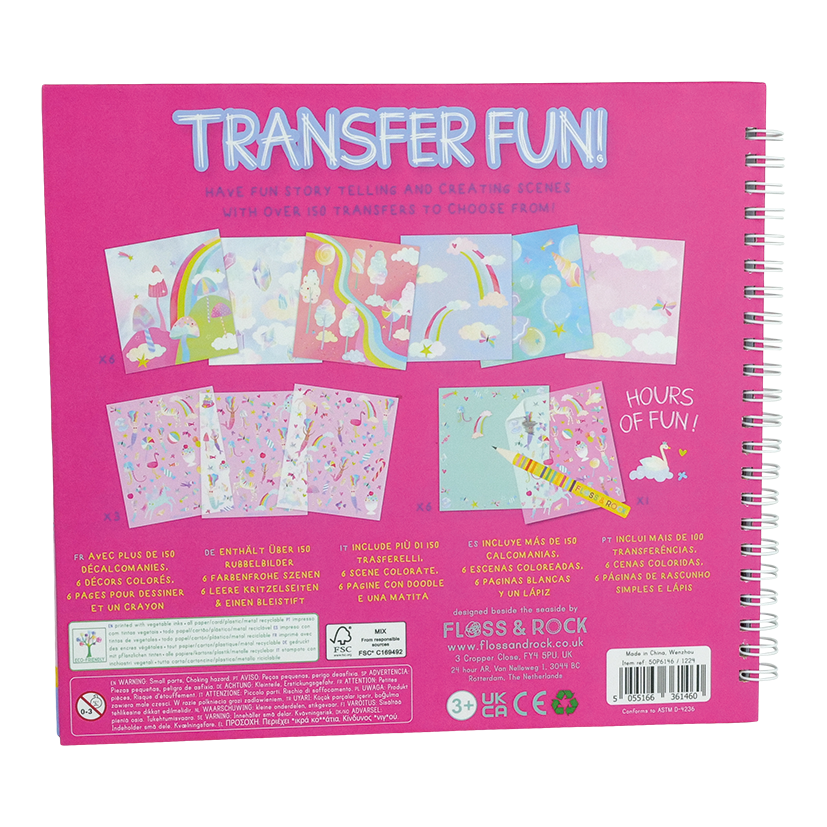There's so much fun to be had with Transfers! This Fantasy Transfer Fun comes with over 150 fantastic Fantasy themed transfers, 6 colourful scenes to place them onto, 6 plain pages for freestyle doodling and a pencil. Open the spiral bound book to find all your transfers neatly stored in the 'My Transfers' pocket, find your chosen illustration and flick through the pages to find the perfect scene to put them onto. Scratch over the top of the drawing with the Floss & Rock pencil provided and lift up the sheet, like MAGIC you'll find them transferred onto the page. Spend many happy hours sparking creativity and making beautiful pictures with mermaids, unicorns, fun fish and more!