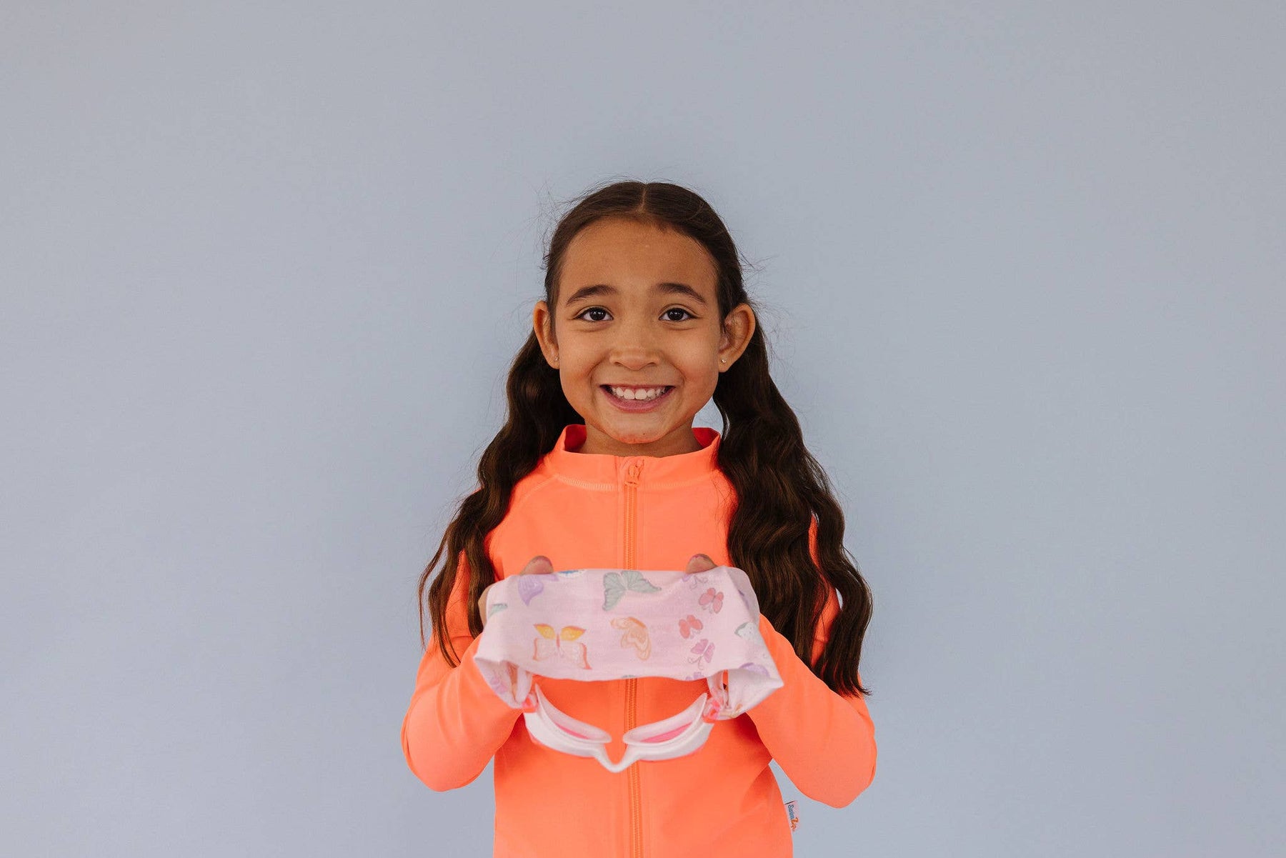 Our Flutter swim goggle features our tangle-free strap in an array of pretty butterflies on light pink and peach background, paired with a white frame and lightly tinted pink lenses. -One size fits kids to adults. Ages 3+ -No more pulled or tangled hair -Fun, fashionable, comfortable -High visibility, anti-fog lenses -Shatter resistant polycarbonate lenses -Hypoallergenic—latex & pvc free -Sensory friendly -Patented