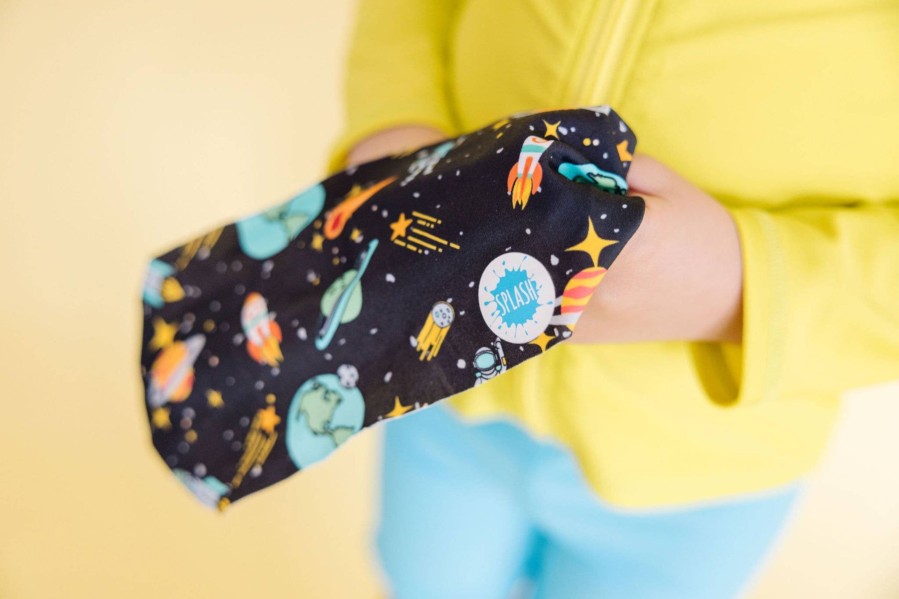 Our Galactic Explorer swim goggle features our tangle-free strap in a colorful outer space and astronaut print. Paired with a black frame and lightly tinted blue lenses.
