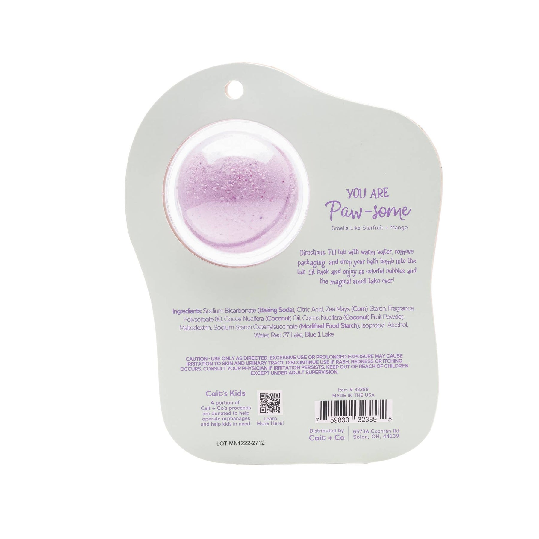 "You are PAW-some!"" Packaged Bath Bomb Smells Like: Starfruit + Mango Our packaged bath bombs are designed exclusively by our in-house team and made with our signature coconut milk recipe, so not only are they FUN, they are also nourishing. How To Use: Fill tub with warm water, remove packaging, and drop your bath bomb into the tub. Sit back and enjoy as colorful bubbles and the magical smell take over! For ages 12 & up Net Wt. 3.5 oz / Made in USA