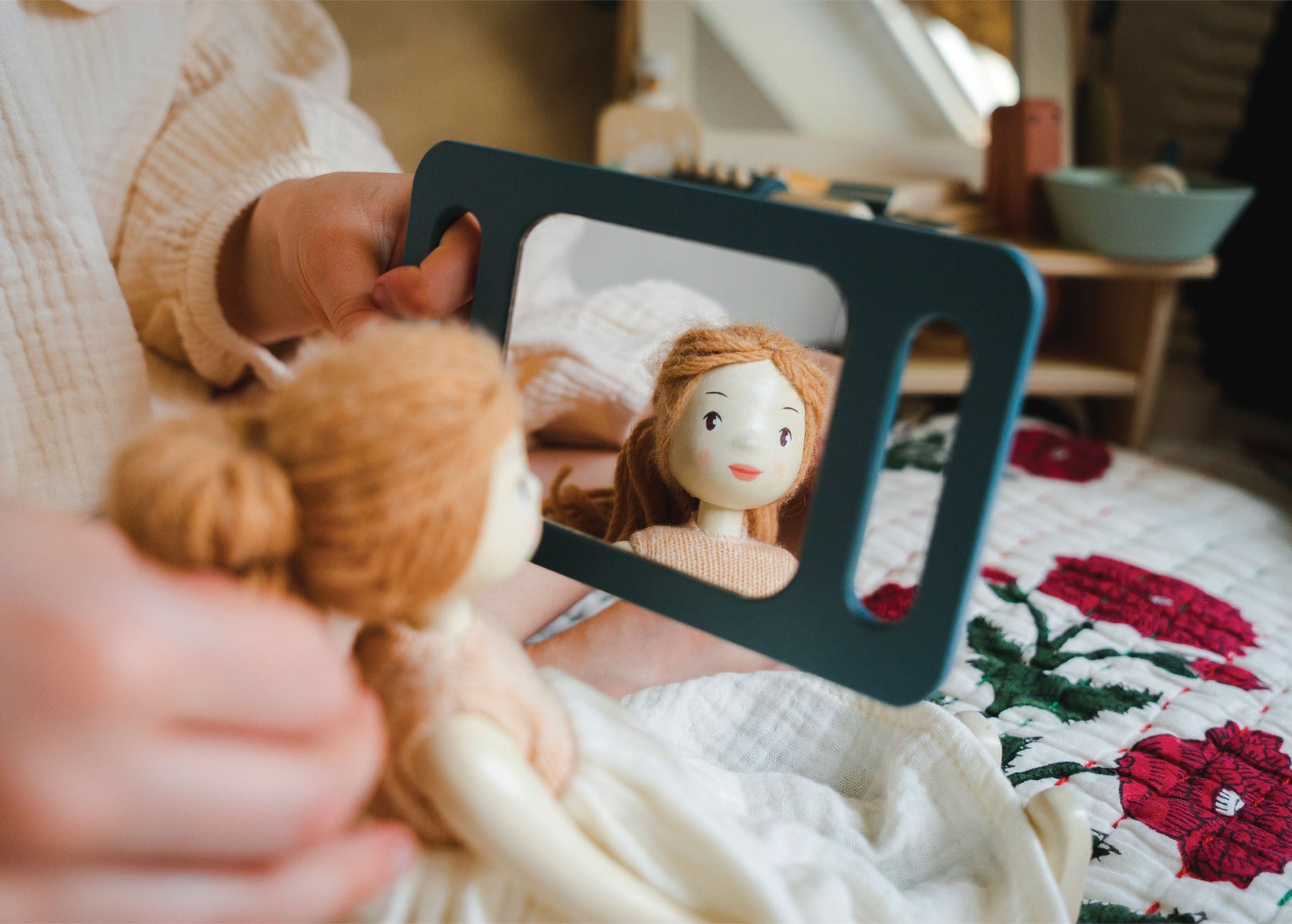 For all hair types, colors and styles, this hair salon offers a full range of hair treatment and styling opportunities. Finished in gender-neutral colors, a tabletop swivel mirror with a storage shelf and a hole for the hair dryer. Set accessories include: