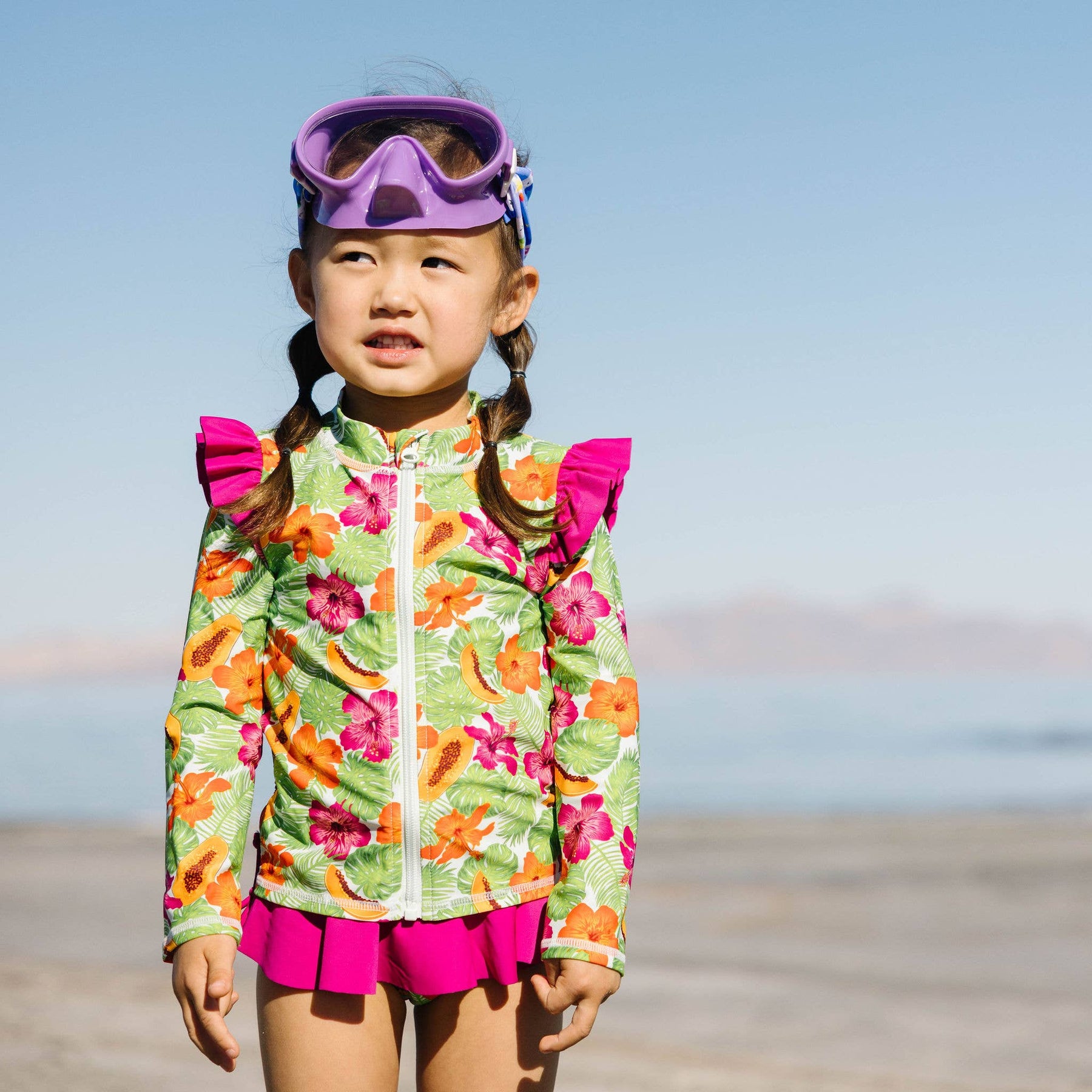 Our Rainbow Unicorn face mask swim goggle features our tangle-free, patent-pending strap in a colorful unicorn print, paired with a purple frame and clear lenses.