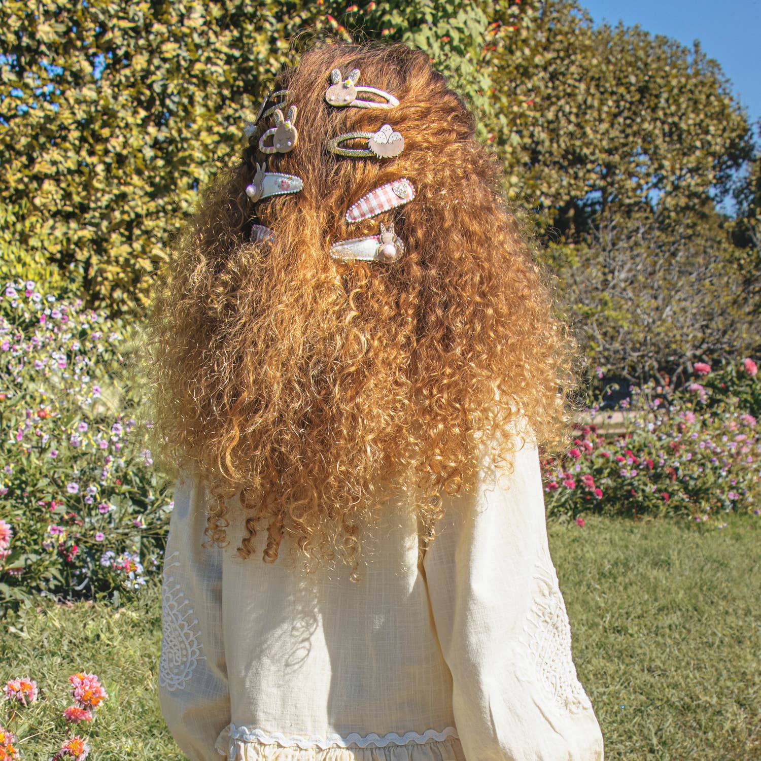 Hop into style with our adorable Stripy Bunny Ponies! Each tie features a charming bunny face adorned with glittery ears and a sweet daisy in her hair, and is set upon a striped grosgrain ribbon wrapped snap clip.